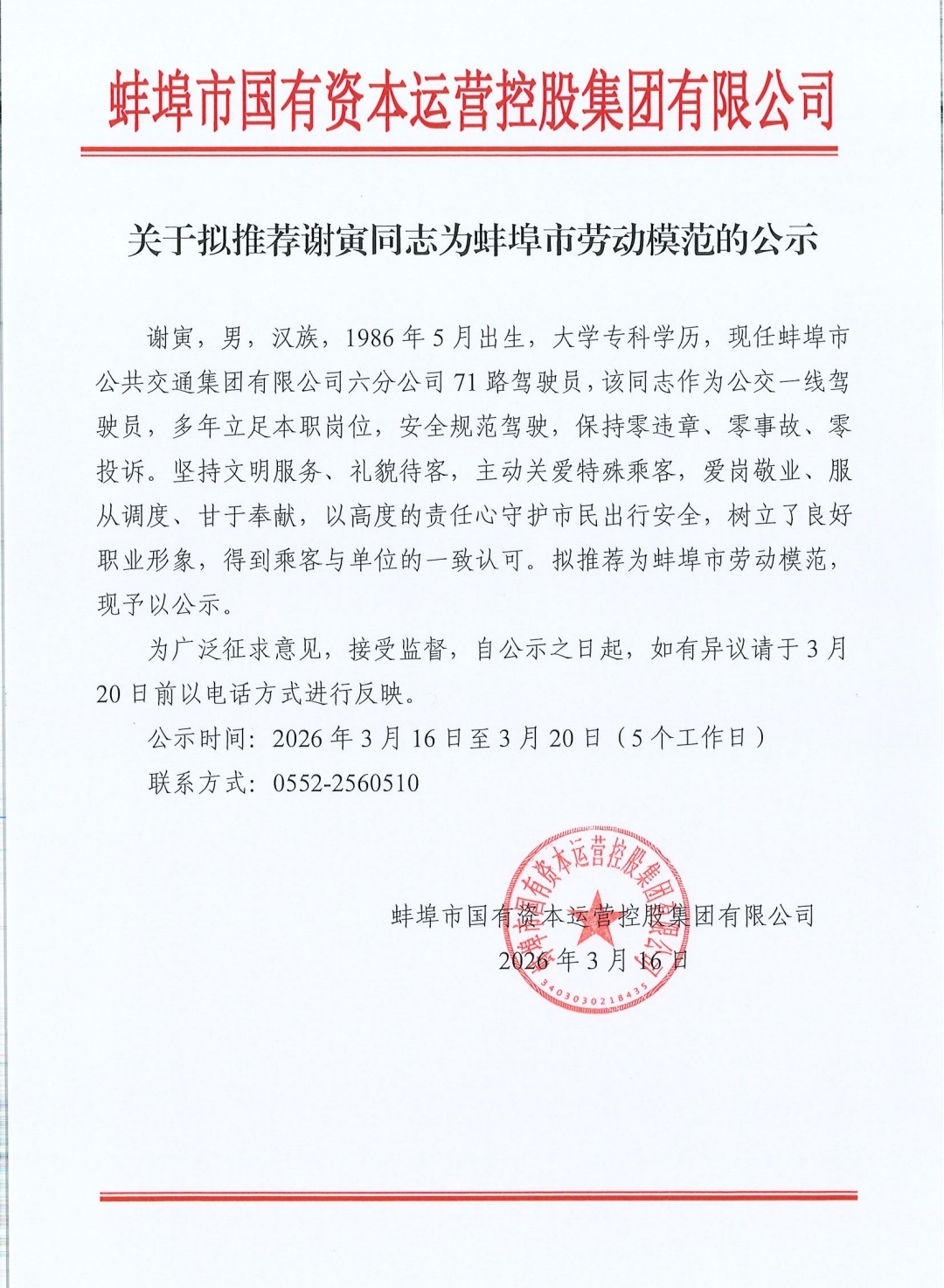 关于拟推荐谢寅同志为蚌埠市劳动模范的公示